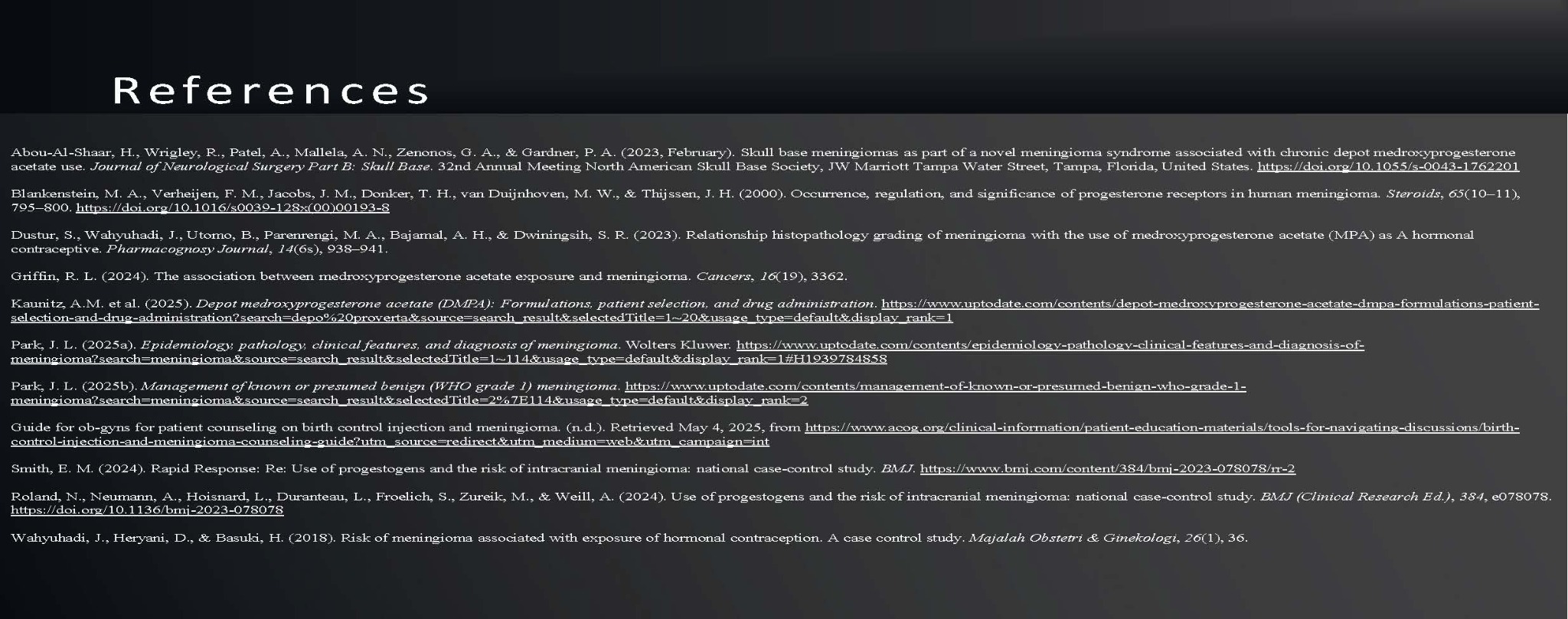 ← Back Published on May 9th, 2025 Presentation: The Relationship Between Medroxyprogesterone Acetate and Intracranial Meningioma: A Review of Current Evidence and Recommendations for Future Study